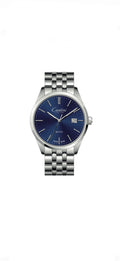 This elegant gent's CANTINI MAYRA,watch embodies true SWISS MADE heritage. Designed for the modern man who appreciates classic aesthetics and reliable performance, it features a sleek 40mm stainless steel case in a polished silver finish. The slim 8.70mm profile ensures it sits comfortably under any shirt cuff. The refined blue dial, protected by durable mineral glass, offers clear legibility and pairs seamlessly with the matching silver stainless steel bracelet. Powered by the trustworthy Swiss Ronda 515 quartz movement, it delivers precise timekeeping and includes a practical date function. With water resistance up to 50 meters, it is perfectly suited for everyday wear. This timepiece is a statement of understated sophistication, backed by a 2-year international warranty for your peace of mind.Your watch comes with a piano high glossy,cherry wooden watch case and bracelet link remover.